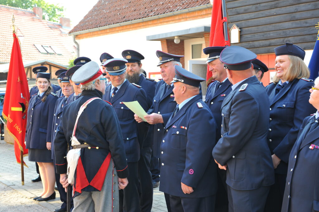 Frau Koss überreichte zudem einen symbolischen Scheck über 100 € als Anerkennung für die geleistete Arbeit. Auch zahlreiche befreundete Feuerwehren nutzten die Gelegenheit, ihre Glückwünsche persönlich zu überbringen.
