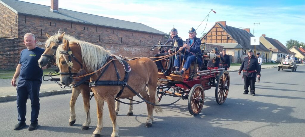 Wir waren mit 7 Kameraden in historischen Uniformen vor Ort und nahmen gemeinsam mit unserer historischen Handdruckspritze von 1904 am großen Festumzug teil. Ein besonderes Highlight war, dass unsere Spritze dieses Mal von einem Pferdegespann gezogen wurde – ein Anblick, der bei den Zuschauern für viel Begeisterung sorgte.
