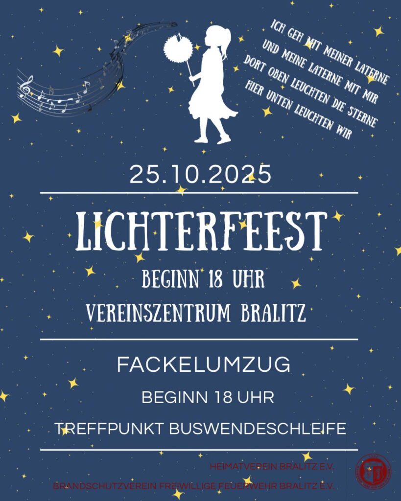 Am Samstag, den 25. Oktober 2025, laden der Heimatverein Bralitz e.V. und der Brandschutzverein Freiwillige Feuerwehr Bralitz e.V. herzlich zum diesjährigen Lichterfest ein.