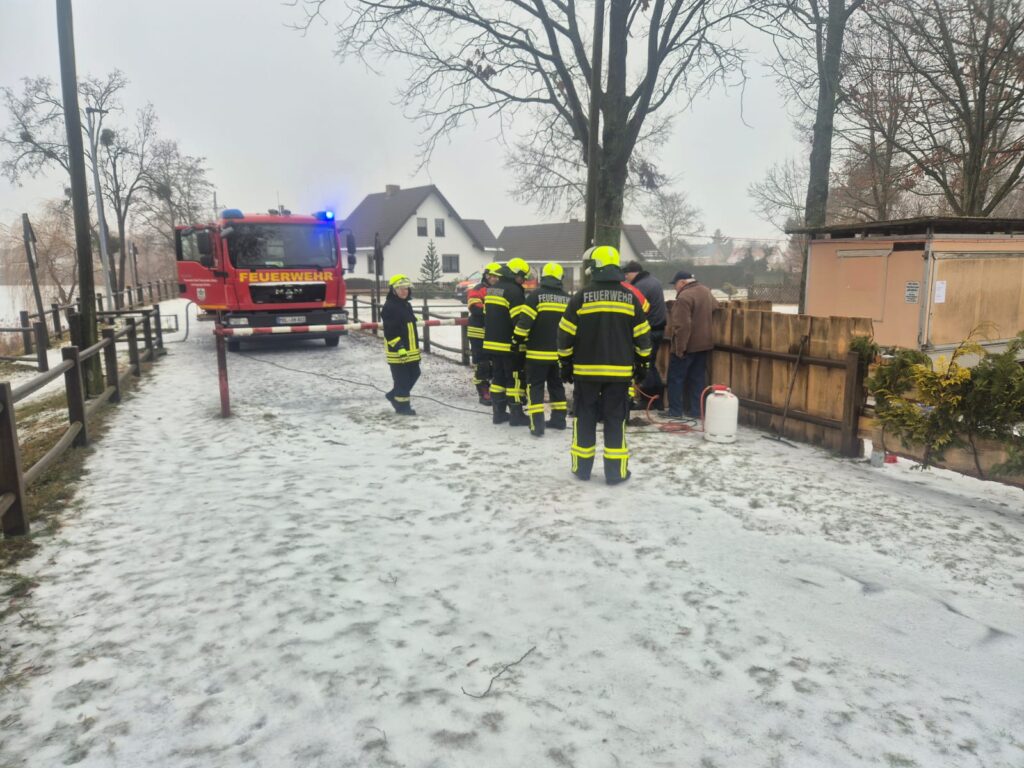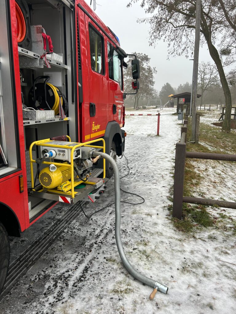 Noch während dieses Einsatzes wurde die Feuerwehr über einen Anwohner auf einen Rohrbruch am Imbiss am Dornbuschsee aufmerksam gemacht. Die Meldung wurde umgehend an die Leitstelle weitergegeben und wir begannen mit der Erkundung vor Ort. Ziel war es, die Wasserversorgung schnellstmöglich abzustellen, um weitere Schäden zu verhindern.
