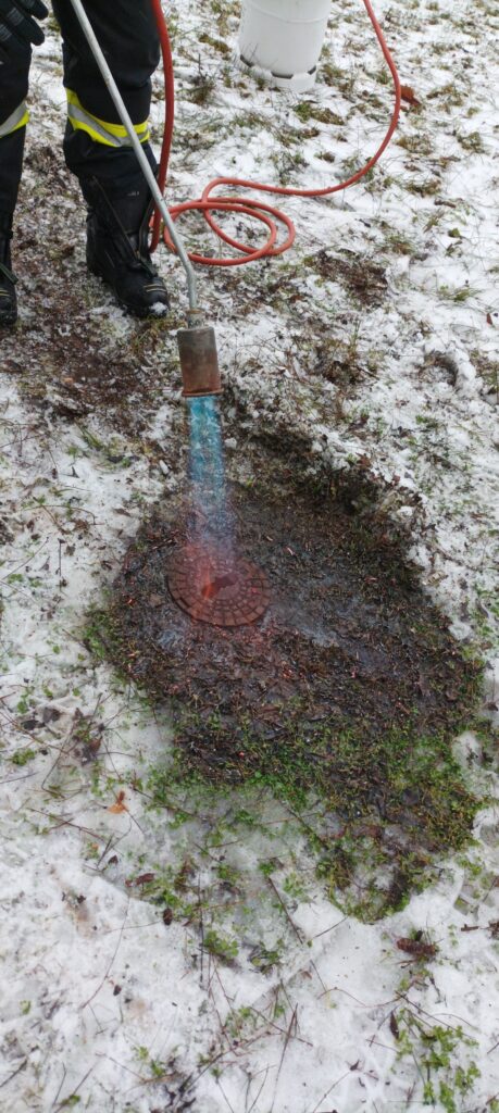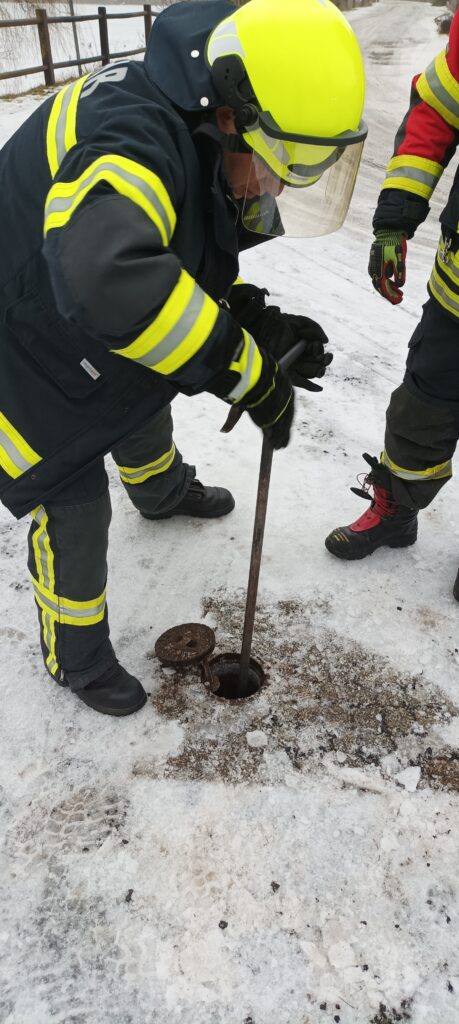 Die Suche nach den zuständigen Unterflurhydranten gestaltete sich äußerst schwierig. Der Boden war noch gefroren und die Metallabdeckungen der Hydranten waren entweder festgefroren oder stark korrodiert. Mit verschiedenen Mitteln versuchten wir, die Abdeckungen zu öffnen, unter anderem durch vorsichtiges Auftauen mit einem Brenner.