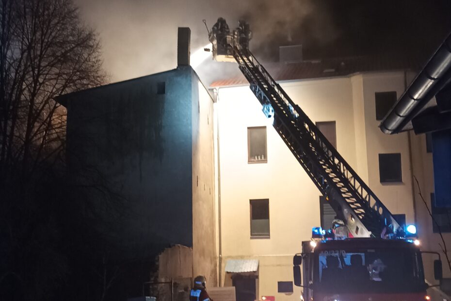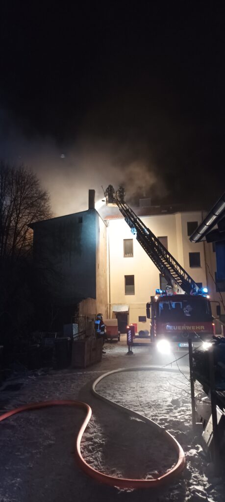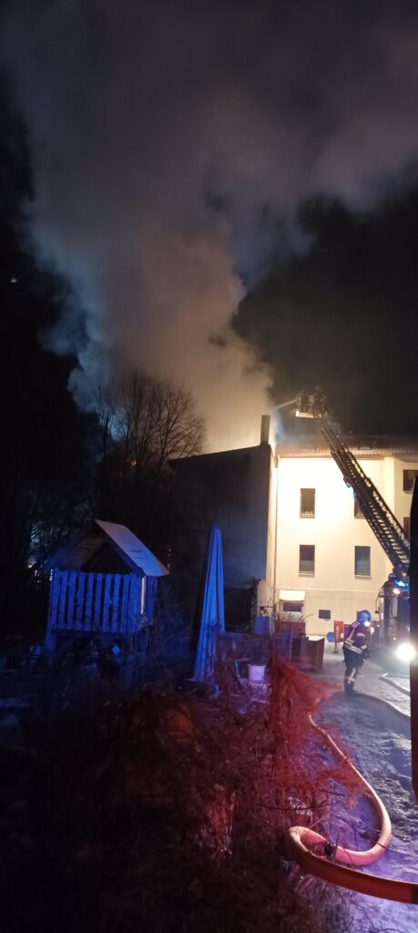 Gegen 03:00 Uhr konnten wir mit dem Rückbau beginnen. Die Löscharbeiten zogen sich insgesamt bis in die frühen Morgenstunden. Der Dachstuhl des leerstehenden Gebäudes war stark beschädigt und drohte zeitweise einzustürzen. Gegen 05:00 Uhr war das Feuer weitestgehend gelöscht, Nachlöscharbeiten und Kontrollen dauerten weiterhin an.