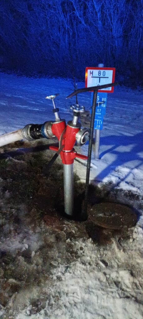 Hierfür verlegten wir sechs B-Längen vom Hydranten bis zum Tanklöschfahrzeug. Der Hydrant gestaltete sich aufgrund der winterlichen Witterung als schwierig zu handhaben, da er eingefroren war und zunächst gangbar gemacht werden musste.