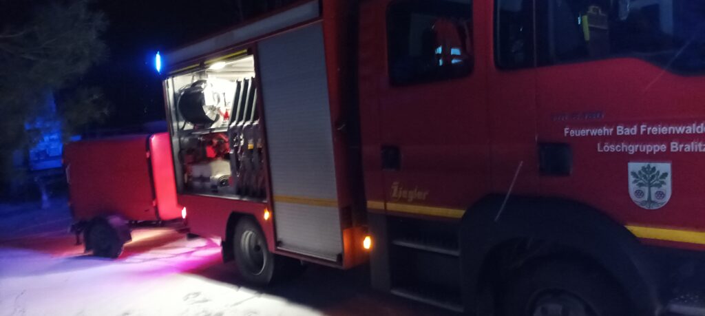 Nach unserem Eintreffen an der Einsatzstelle warteten wir zunächst auf unsere konkrete Aufgabe durch die Einsatzleitung. Zu diesem Zeitpunkt hatten die Feuerwehren Bad Freienwalde und Altranft bereits mit den Löscharbeiten begonnen und bekämpften das Feuer von der Straßenseite aus unter anderem über die Drehleiter.
