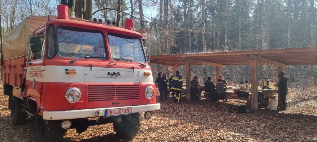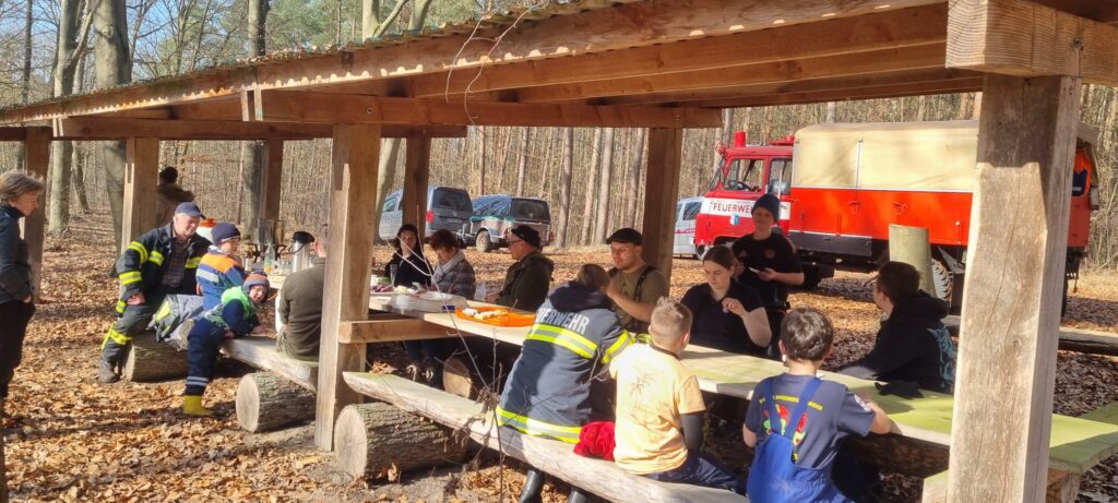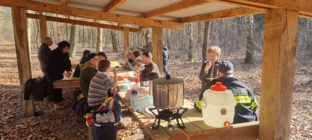 Für das leibliche Wohl sorgten der Feuerwehrverein sowie weitere Helferinnen und Helfer. Es gab Kuchen, Kaffee und Getränke für alle Beteiligten. Zur Mittagszeit wurden außerdem frische Bockwürste erwärmt, die gemeinsam mit einem Brötchen verspeist werden konnten.