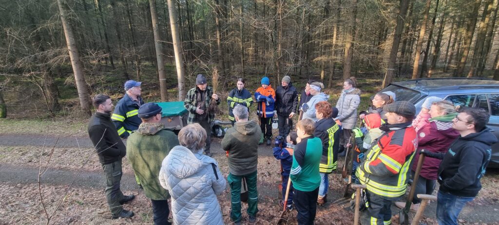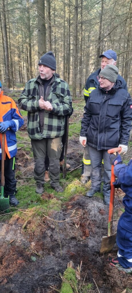 Nach einer kurzen Einweisung in die richtige Pflanztechnik durch die Förster Sebastian Piesker und Frank Zühlke machten sich alle Beteiligten an die Arbeit. Mit insgesamt 26 Helferinnen und Helfern ging die Arbeit gut voran. Besonders erfreulich war, dass auch einige Kinder tatkräftig mit anpackten und so einen kleinen Beitrag zum zukünftigen Wald leisten konnten.